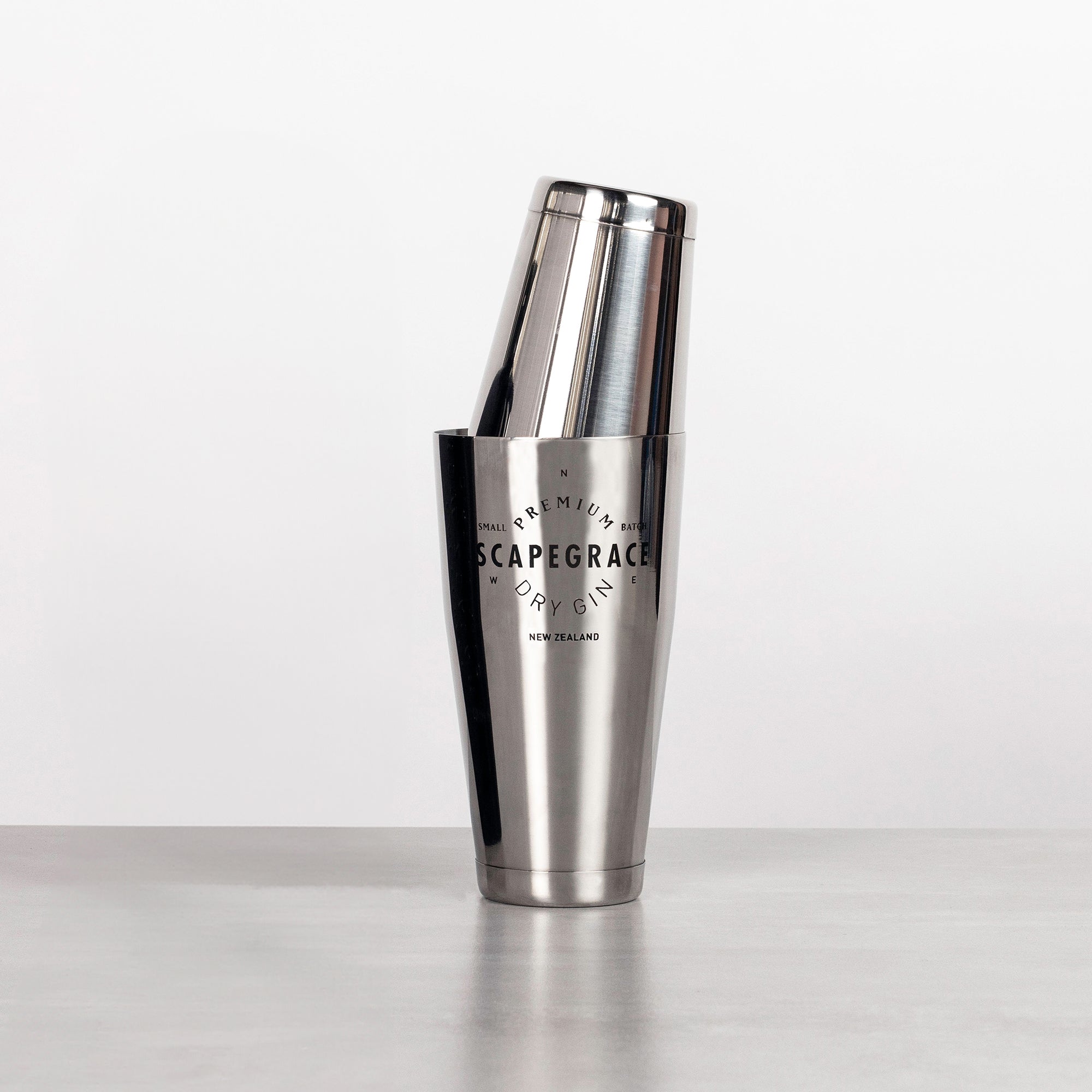 - Professional two-piece Boston shaker with Scapegrace branding